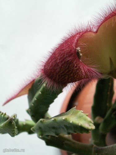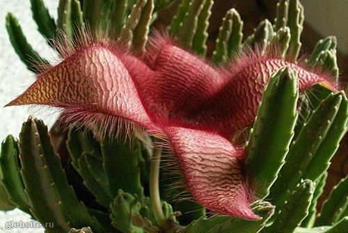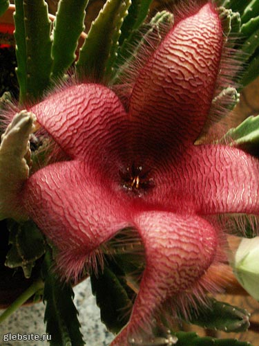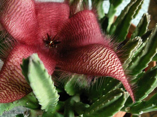 Самое интересное начинается летом, когда она начинает изо всех сил цвести. Среди лапок появляются бутоны, а потом и цветки в виде багровой пентаграммы. Они быстро раскрываются, цепляются щупальцами (иначе их лепестки не назвать) за растение, и комнату наполняет запах мертвечины. Дело в том, что стапелию опыляют мухи.
