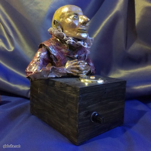 Материалы — деревянная шкатулка, папье-маше, плата Ардуино, серводвигатели и много-много проводов и радиодеталей. И, конечно, щедрая доза черной магии, куда без нее.