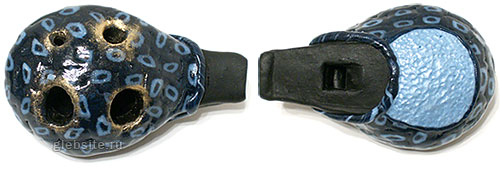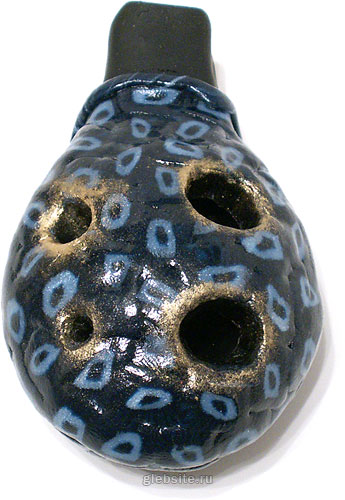 Окарина. Результат долгих экспериментов. Сделана из цернита1, украшена «плиточками», сделанными Юлькой (спасибо ей огромное), покрыта лаком. А самое главное — она звучит! Четыре игровых отверстия, английская аппликатура, издаваемые звуки очень похожи на гамму соль-мажор. Впрочем, можете послушать: