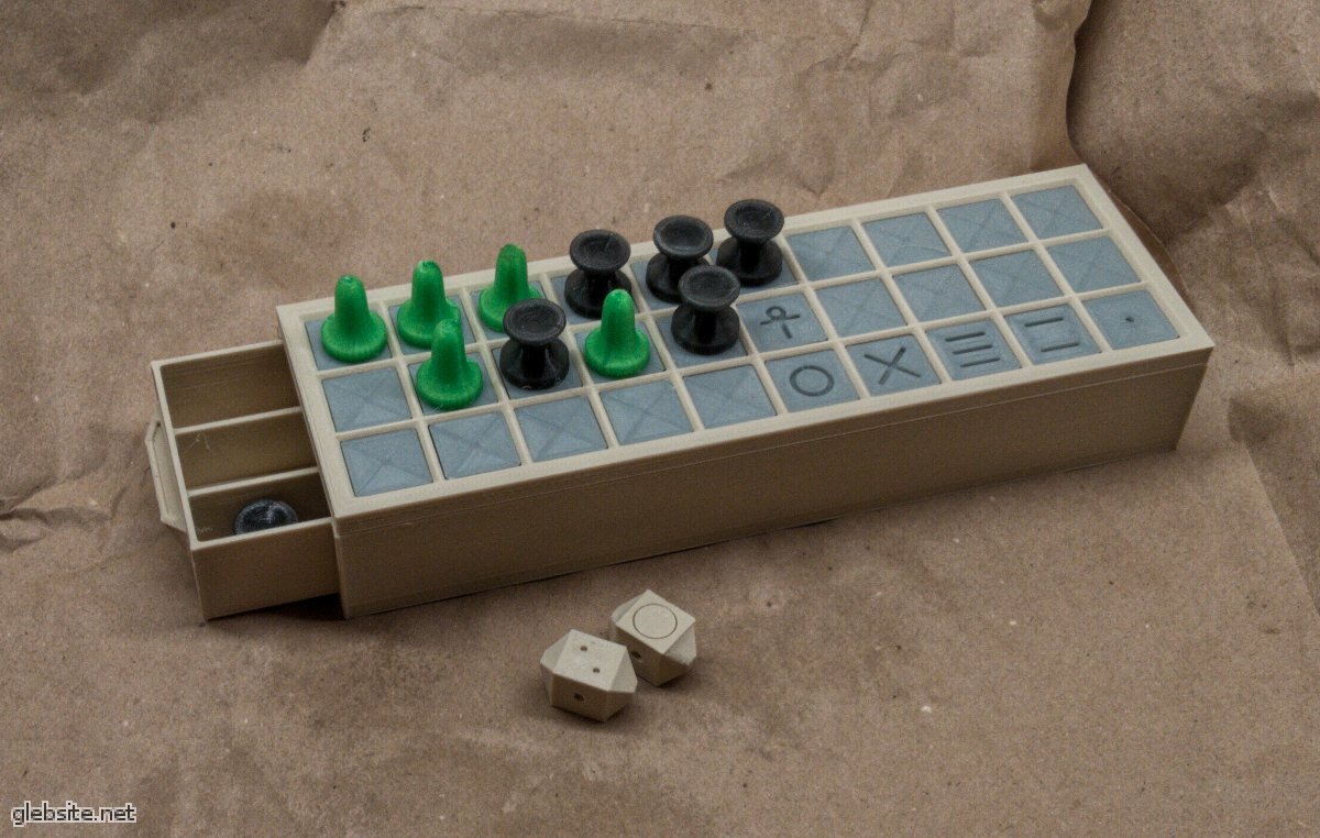 Естественно, с той самой минимальной разметкой. В комплекте фигурки и две игральные кости, полностью заменяющие неудобные палочки.