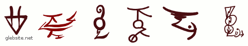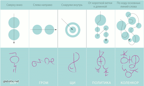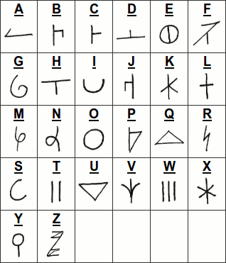 Из этой схемы видно, что каждой букве в дскрипте сопоставлен определенный штрих. При написании слова эти штрихи соединяются последовательно (см. правила чтения ниже), образуя иероглиф, который потом можно также последовательно прочесть. Вот таблица штрихов для английского алфавита: