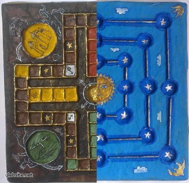 Доска из папье маше, щедро покрытая смешанной техникой. На двух сторонах – две древнейших игры – «Людо» (Парчис, Кеш-Беш) и «Мельница».